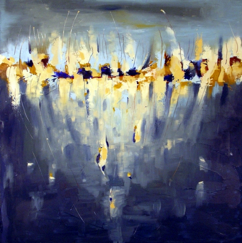 I was intrigued by the December midwinter moon because the long arc of the moon’s path above the horizon makes it the most visible moon of the year. To capture the feel of the brilliant moonlight reflecting off of the snow-covered city, I built up layers of paint with a palette knife to give the piece depth and luminosity.